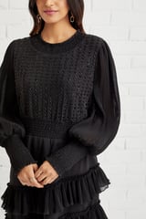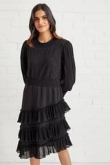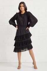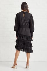 Black Embellished Asymmetrical Tiered Ruffle Midi Dress