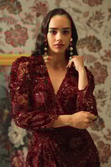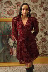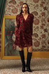 Burgundy Lace Wrap Mini Dress with Velvet Appliqué