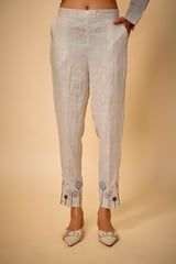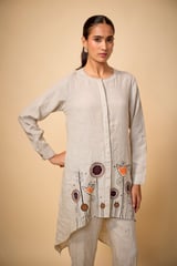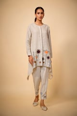Pure Linen Beige Floral Highlow Emb Tunic & Pencil Pants
