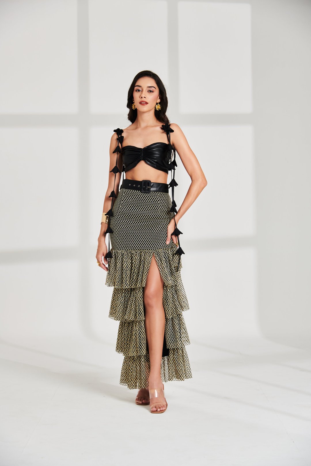 Helena Black & Cream Ruffle Maxi Skirt with Belt