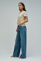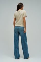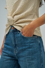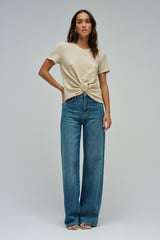 Textured Beige Round-Neck Knot-Front T-Shirt
