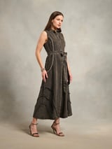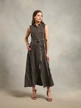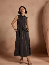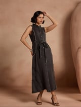 Black Sleeveless Button-Down Belted Midi Shirt Dress