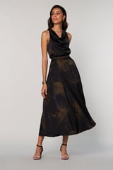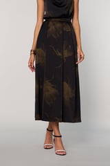Black Satin Tonal Floral Print A-Line Midi Skirt