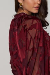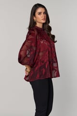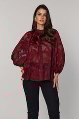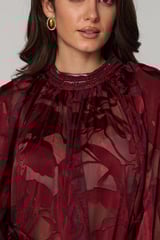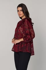 Wine Red Semi-Sheer Jacquard Blouse with Embellished Neck