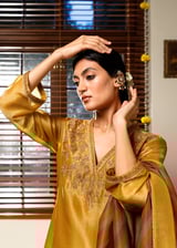 Mustard Tissue Silk Embroidered Straight Kurta Set