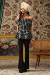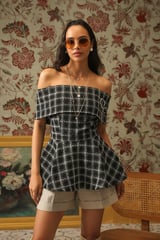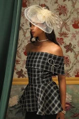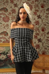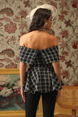 Off-Shoulder Plaid Metallic Tweed Peplum Blouse