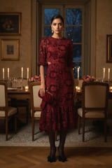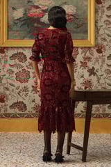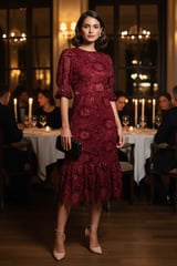Burgundy Lace Appliqué Sequin Cut-Out Midi Dress