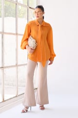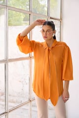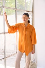 Sunset Orange Satin Tie-Neck Shirt with Balloon Sleeves