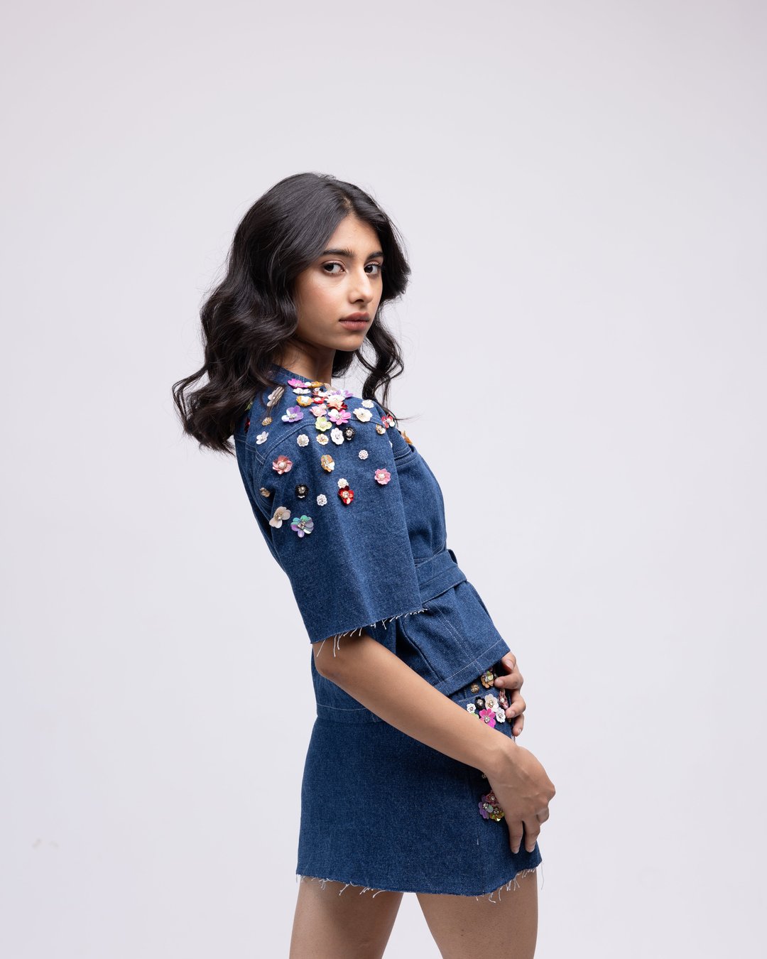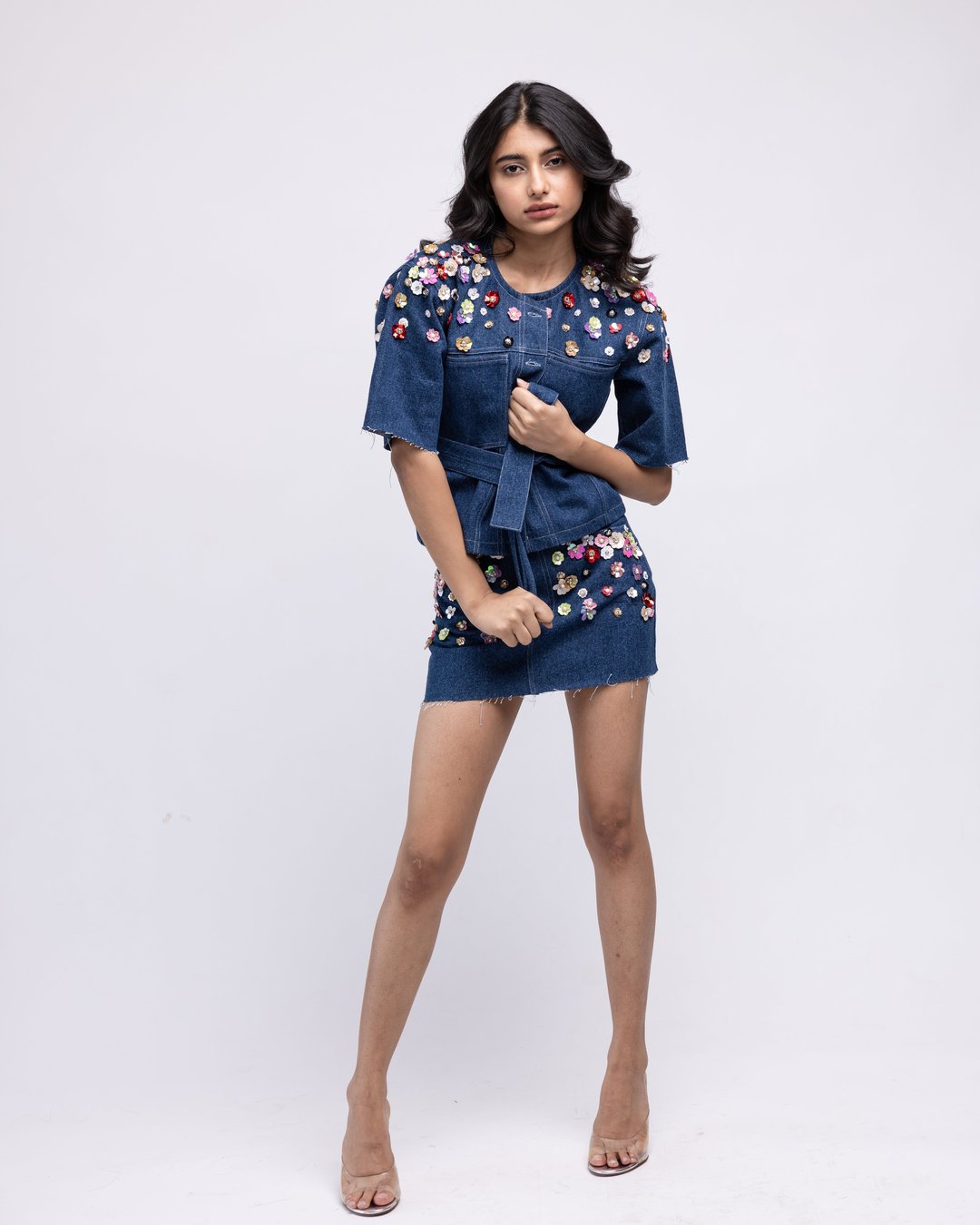 Half-Sleeved Denim Multi-Colour Sequinned Jacket