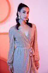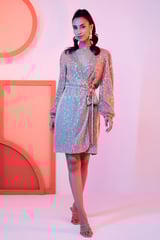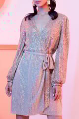 Silver Sequin Wrap Dress with Waist Tie and Full Sleeves