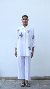 White Linen Embroidered Lounge Shirt with 3/4 Sleeves
