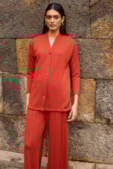 Rust Textured Knit Popover Top with Band Collar