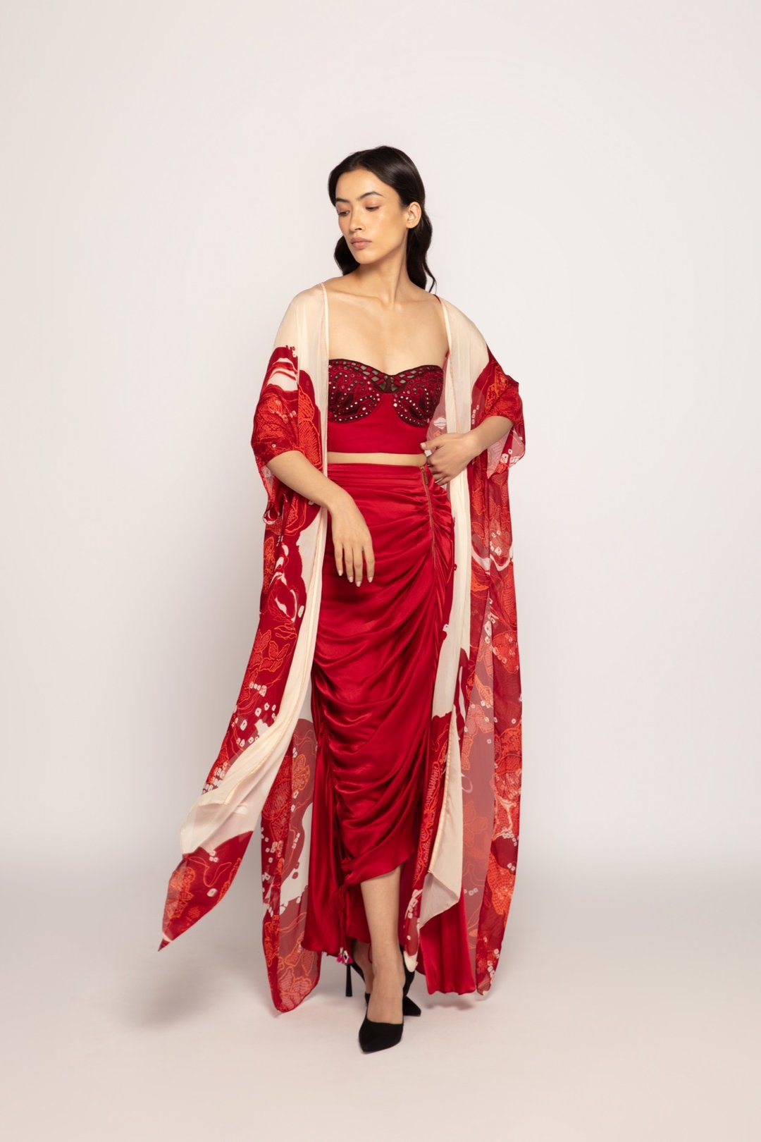 Bandhani Print Maxi Batwing Cape Maroon Ivory