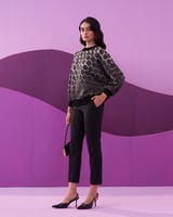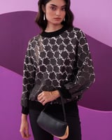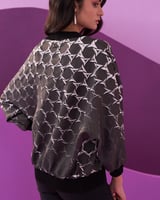 Black Geometric Print Pullover Top with Ribbed Trims