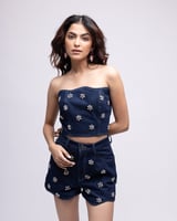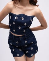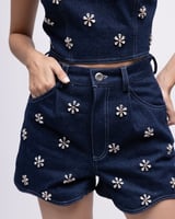 High-waisted scalloped denim shorts with embellishments