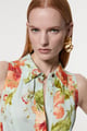 Premium Viscose Linen Floral Topstitch Halter Neck Woven Midi Dress with D Ring Detail