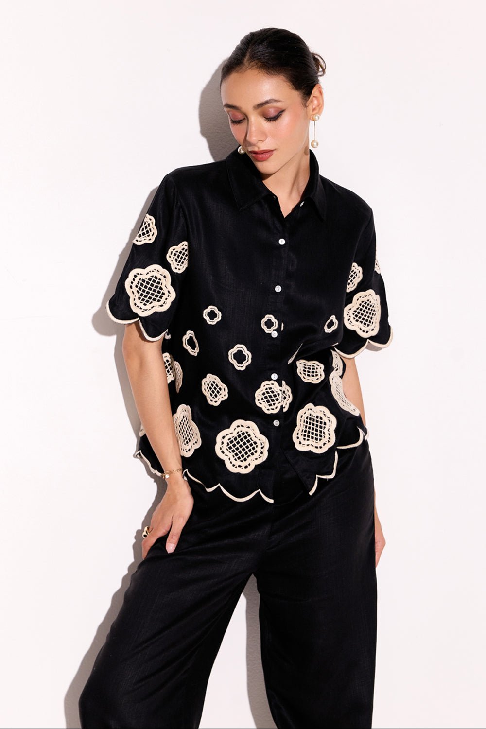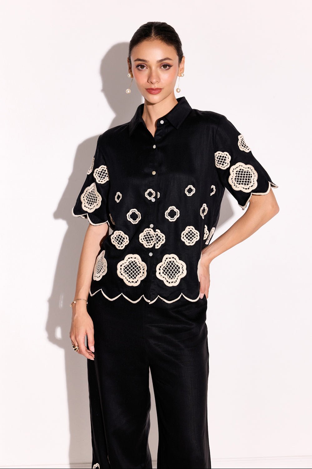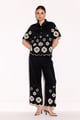 Monochrome Honeycomb Flowers Embroidered Co-Ord Set Black