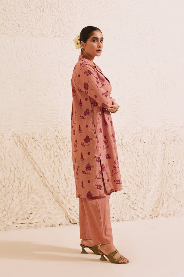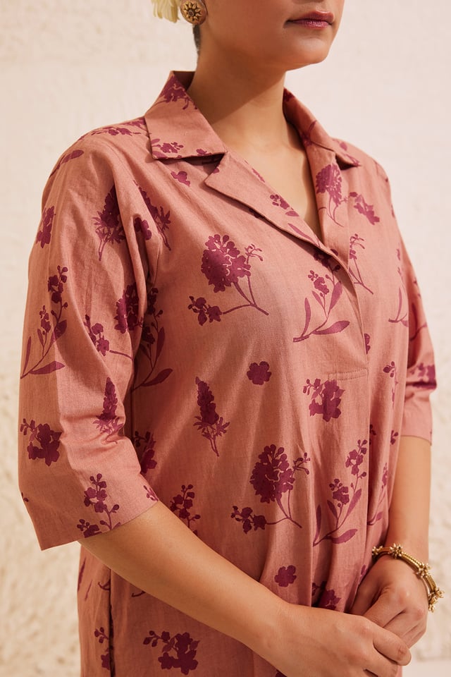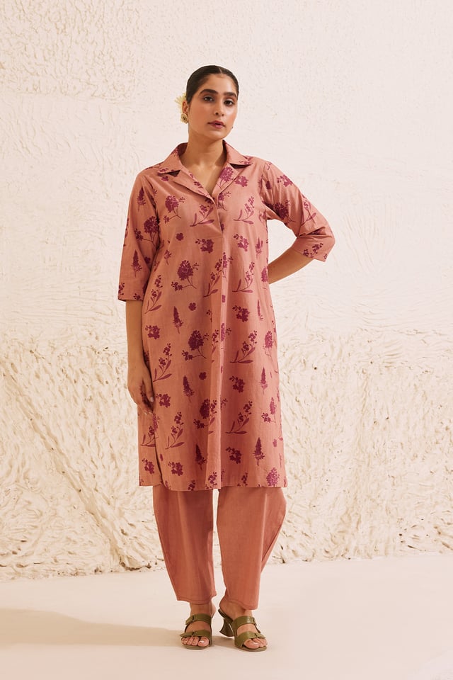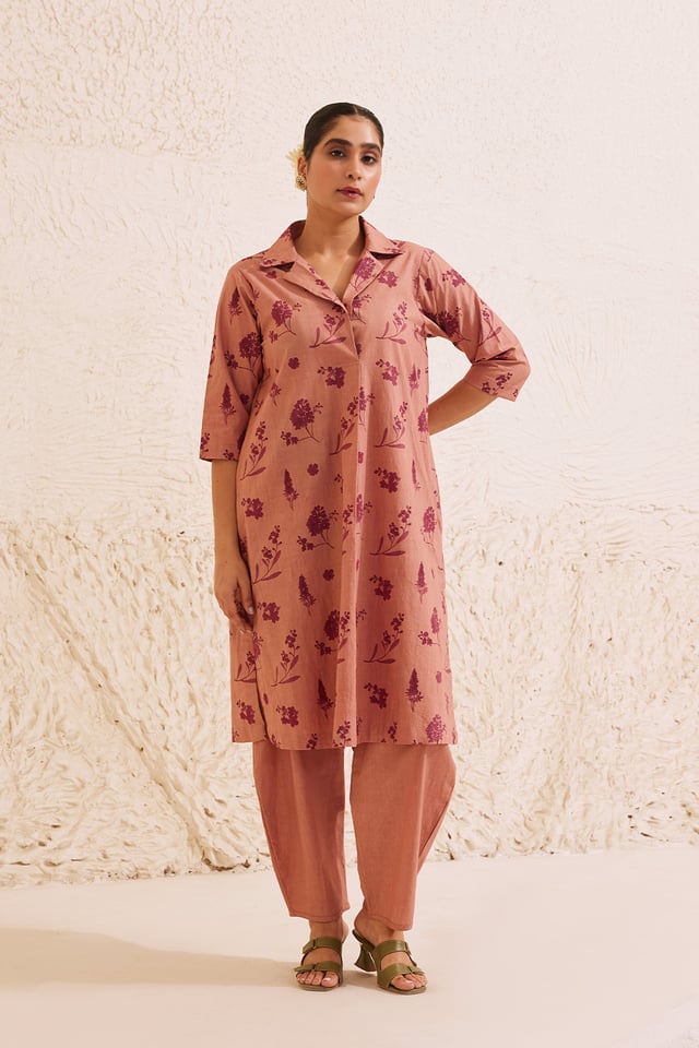 Onion Pink Poplin Hand Block Floral Print Kurta Set