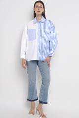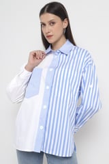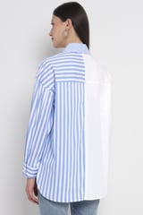 White and Light Blue Colorblocked Striped Button-Up Shirt