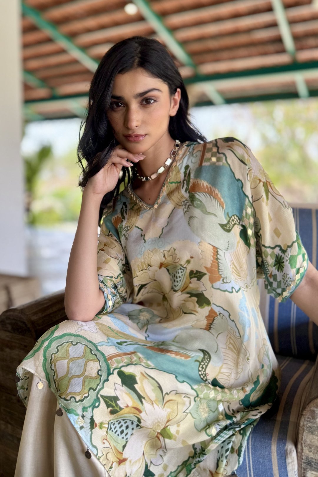 Beige V-Neck Embellished Print Co-Ord Set