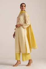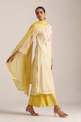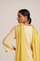 Cream/Gold Striped Kurta Set with Floral Neck Embroidery