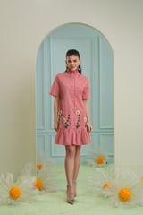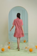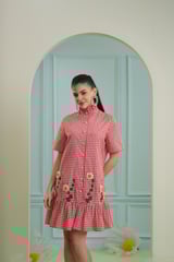 Red and White Gingham Mini Shirt Dress with Embroidery