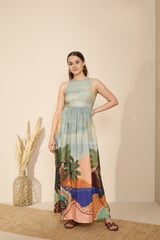 Green Tropical Landscape Print Fit and Flare Maxi Dress