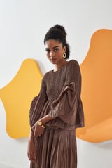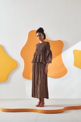 Brown Smocked Peplum Top and Pleated Pants Co-ord Set