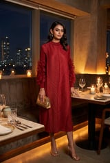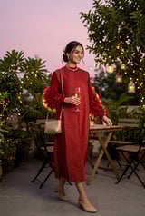 Maroon High Neck Pleated Midi Dress with Ruffled Sleeves