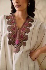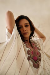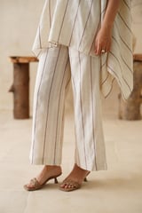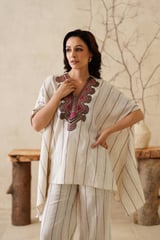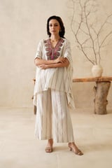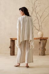 Cream Striped Cotton Dobby Poncho and Wide-Leg Co-ord Set