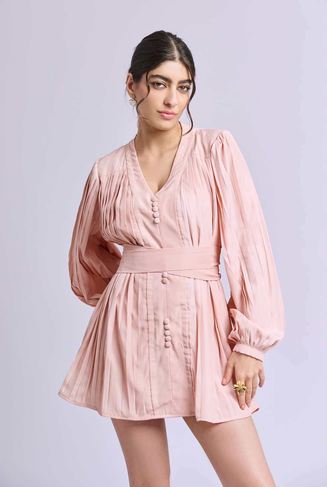 Jenny Soft Pleated Baby Pink Balloon Sleeve Dress