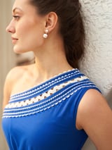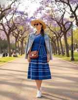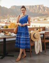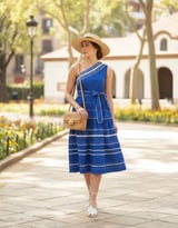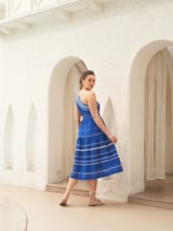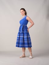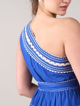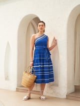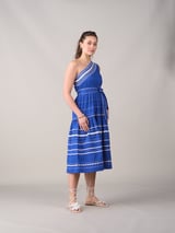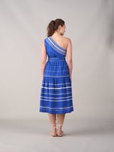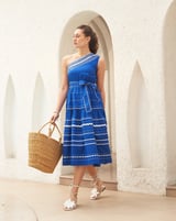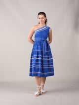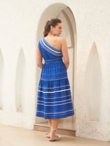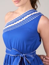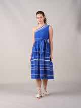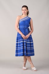 Blue One-Shoulder Tiered Midi Dress with Waist Tie