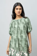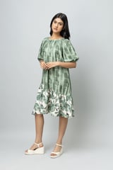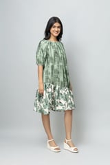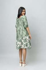 Sage Green Printed A-Line Midi Dress with Tiered Hem