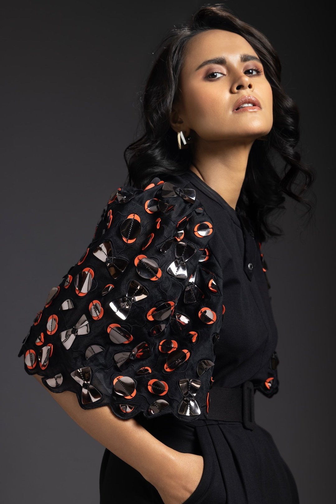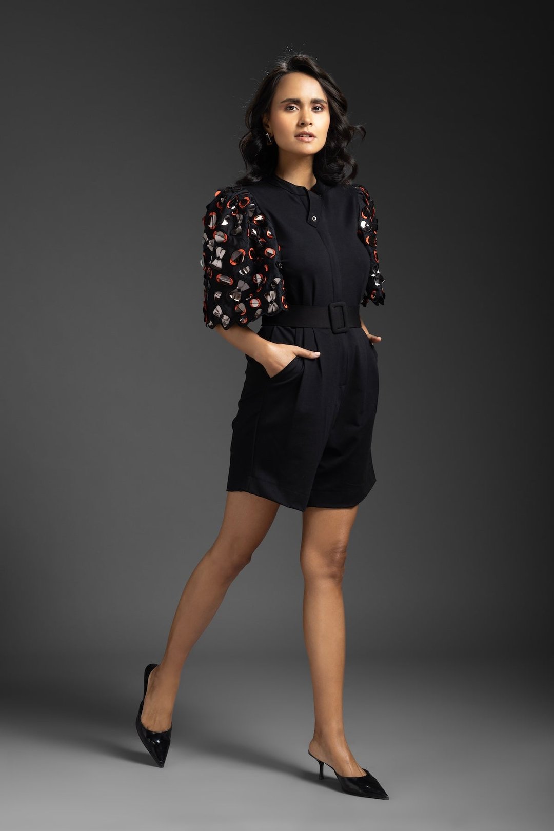 Playsuit with Neon Metallic Sleeve Detail and Belt